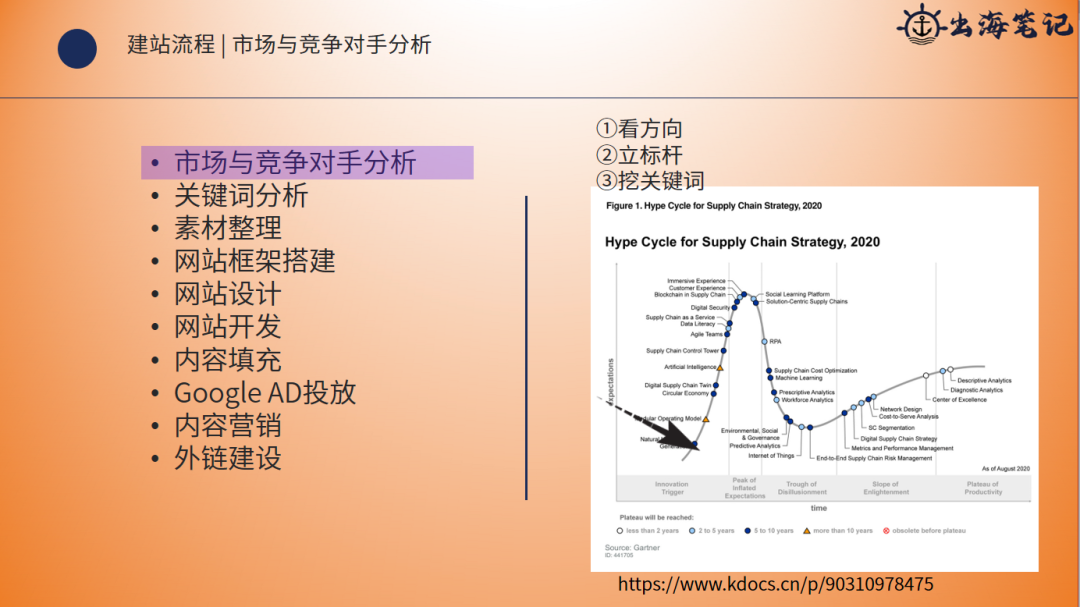 那么第三个就是挖关键词,可以从这个行业或竞争对手里面去挖关键词,把之后的流量道路铺平。那么另外这里我贴一张图,这个图是一个 Hype cycle,就是一个所谓很著名的周期图。