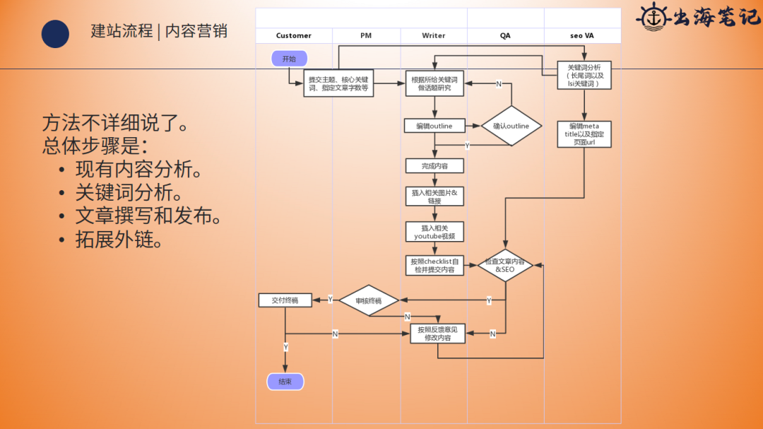 比如说PM把主题给到写手,通常是外包的写手,可能公司级那会写手,即使是专业8级,他也不容易写出一个比较好的一个文章。根据所有的关键词做这个话题的研究,编辑,如果是ok,继续往下,不行再修改。ok了以后,QA(质检)审核来通过了以后才完成内容,嵌入相关图片和链接,嵌入YouTube视频,这些是一些SEO的考虑。