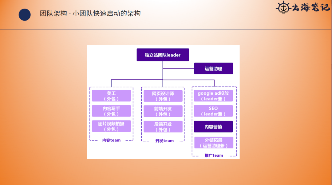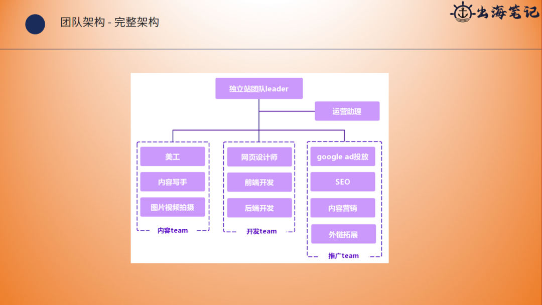 那么一个完整的架构,实际上我是说独立站差不多,我觉得是包括这几个部分,那么就是首先是独立站的leader/团队leader,他会有一个运营的助理,运营的助理会辅助的做一些事务性的工作。