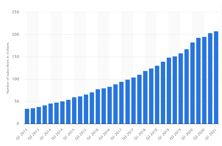 注: 截至2021年第一季度,Netflix的全球付费用户超过2亿(以百万为单位,来源:statista)