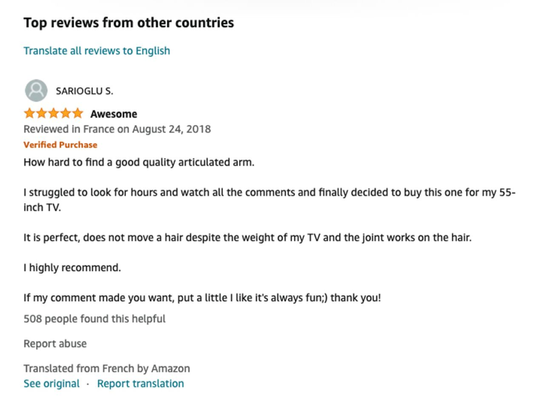 报道讲完了rating滥用以后,马上就把矛头指向了国际评论。报道指出,国际评论的滥用更加严重,很多listing本来是A产品,但是下面的国际评论很多说的都是B产品。其中还专门举个一个例子说明这种情况:一个明明是卖hair clippers的listing,结果下面的国际评论有几条内容说的却是TV mount,完全就是文不对题,货不对板。