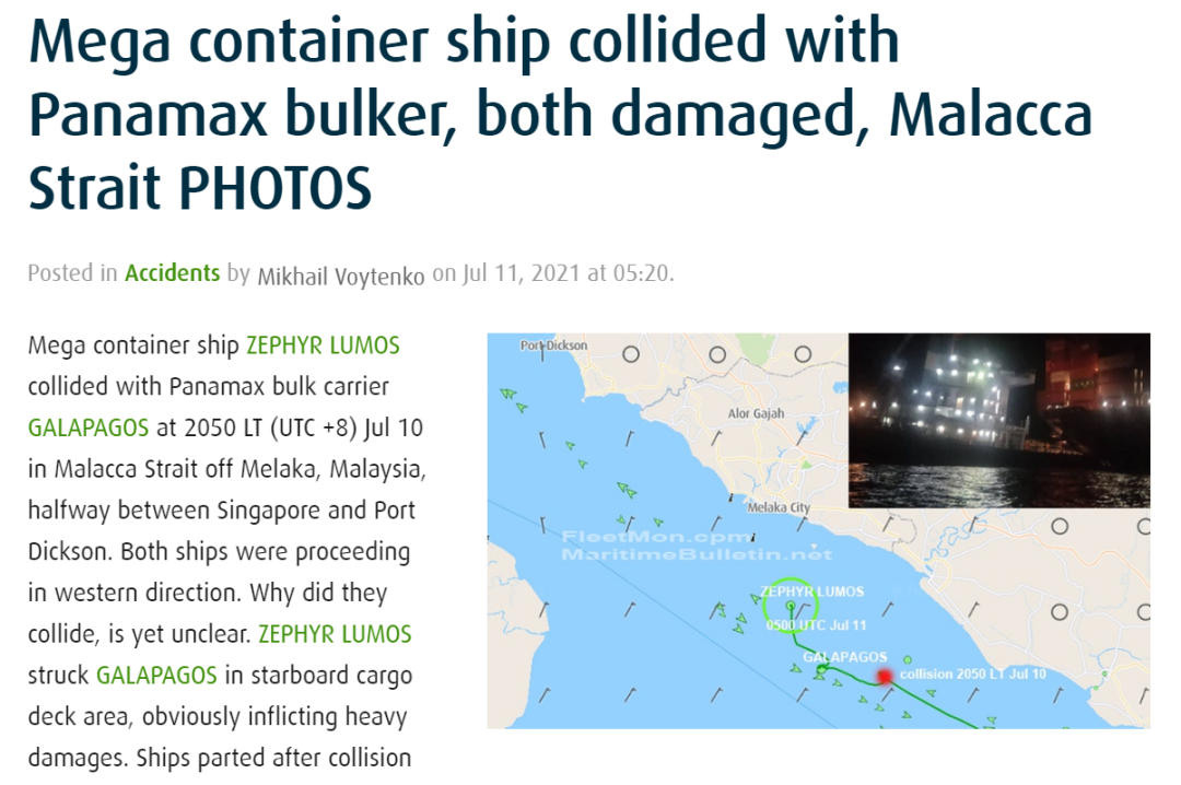 撞船事故发生在全球最繁忙的海上要道马六甲海峡,且事故发生在晚上!撞船事故的一方是超大型集装箱船ZEPHYR LUMOS,另一方是巴拿马型散货船 GALAPAGOS ,撞船位置位于新加坡和迪克森(Dickson)港之间。两艘船都在向西行进。他们为什么会发生碰撞?目前还不清楚是什么导致两艘大型船舶相撞!