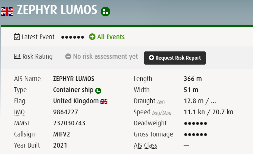 来自大船期的公开信息显示,这次发生撞船事故的超大型集装箱船ZEPHYR LUMOS轮,据了解,集装箱船“ZEPHYR LUMOS”轮的载箱量为15000TEU,挂英国旗,刚刚于2021年1月交付,目前在THE联盟的地中海航线MD2上运营。