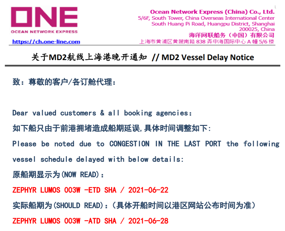 此前,ONE曾发布“关于MD2航线上海港晚开通知”,提到“ZEPHYR LUMOS”轮船期延误。没想到,船舶在开航后不久,就发生了撞船事故。