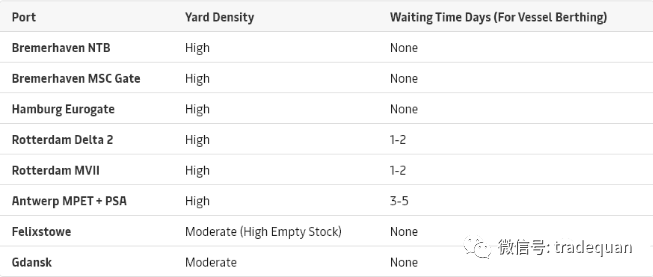 不莱梅、汉堡、鹿特丹、安特卫普、费利克斯托、格但斯克的堆场密度和船舶等待时间情况: