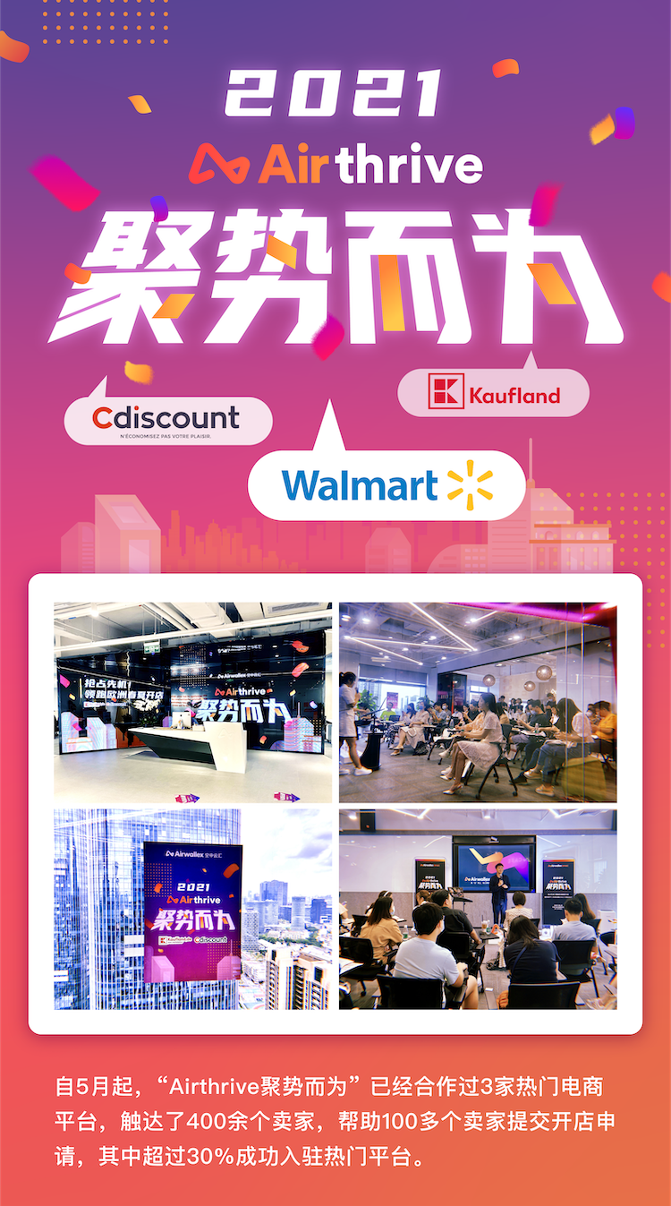 自5月首次举办以来,Airthrive 聚势而为已经与多个热门平台如沃尔玛, Wayfair, Kaufland.de, Cdiscount 等一起举办了线上、线下沙龙。原本无法接触到平台招商经理的卖家们,通过参加活动,不但更深入地了解到自己和平台的匹配度,也得到了入驻平台近水楼台的优势。超过20%参与活动的卖家们通过活动匹配到了合适自己的平台,并且赢得注册先机。