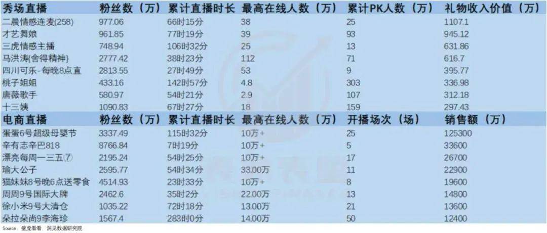 我们分别加总上图秀场直播组、电商直播组主播的收入,代入收入模型公式,测算出的数据显示:电商模式下的平台和主播收入,远高于秀场模式。