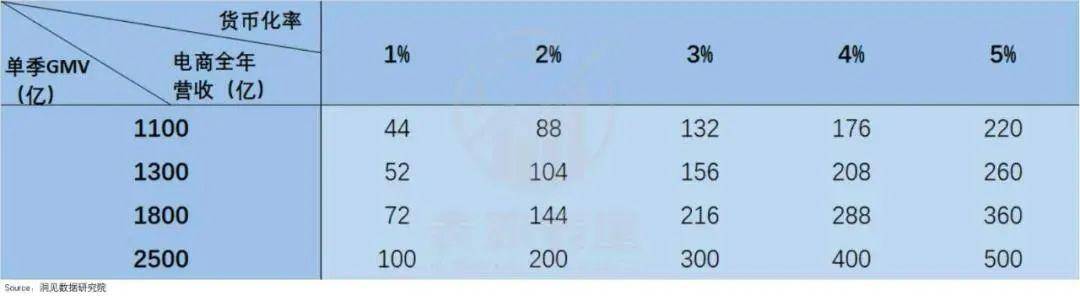 那么,根据公式:电商营收=GMV*货币化率,可以得到如下图的电商收入表现。其中,在货币化率提升至5%,单季GMV2500亿的情况下,快手电商业务的全年营收规模可达500亿。