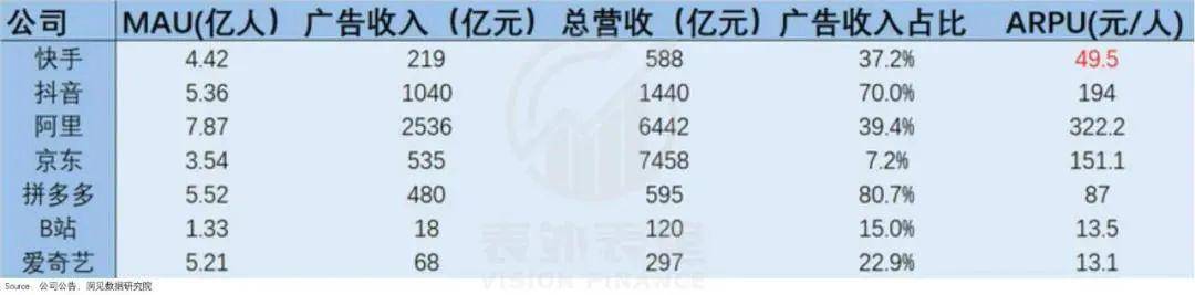 快手也很早就瞄上了这块“肉”,但就数据表现(以2020年为例)来看,收获有限:不仅整体的广告收入与抖音相比差距颇大,ARPU值也处于行业较低水平。