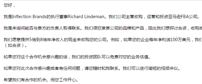 卖家C:前不久接到一个上海的电话,对方称是德国亚马逊第三方品牌收购集团Razor,说要收购我英国站的品牌和店铺,加微信后表明了来意,不过我没理他。