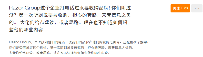 有卖家发现,Razor Group为自己提出的收购报价就是年利润的2-5倍。早在上个月底,论坛上就有卖家在讨论,关于国外企业Razor Group打电话来收购自己公司的事情,而很多卖家在面对第一次被收购时,心中有无数疑惑想要解开: