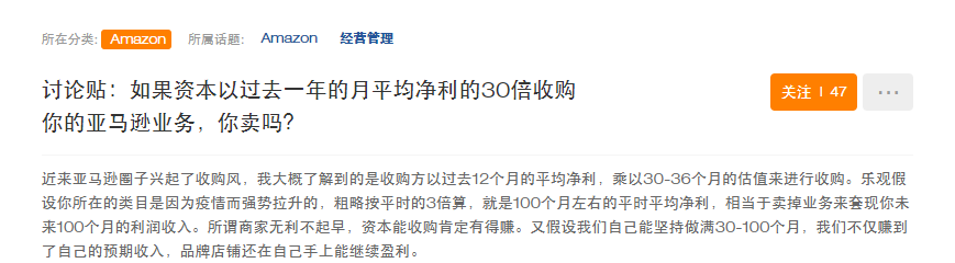 当有卖家在论坛突发奇想,发帖问道:如果资本以过去一年的月平均净利的30倍收购你的亚马逊业务,你卖吗?