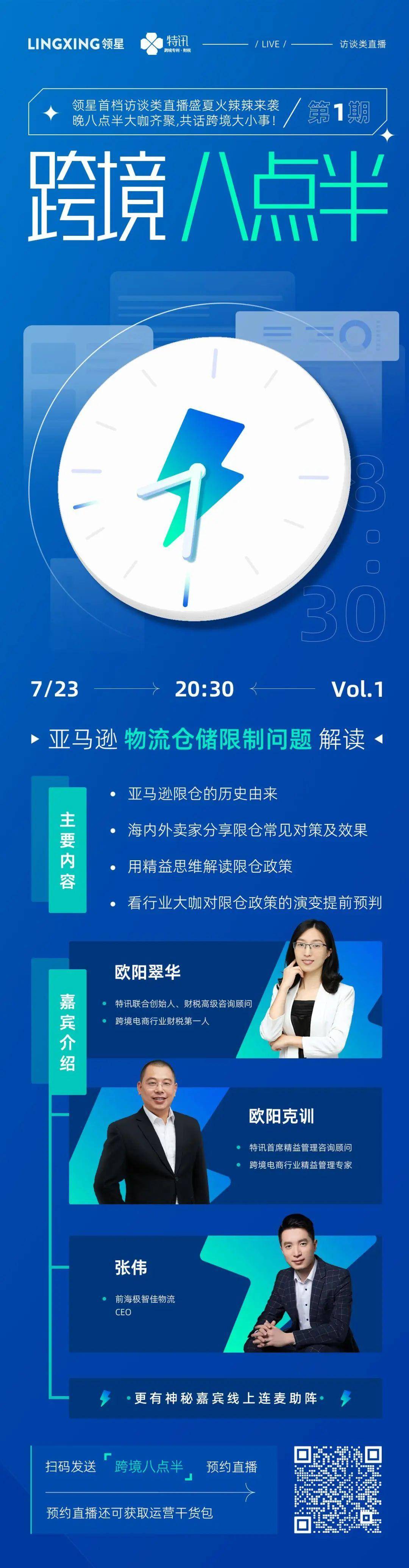 以上困惑让领星首档访谈类直播《跨境八点半》告诉你,第1期《亚马逊物流仓储限制问题解读》火热来袭~扫描下方二维码??,即可预约直播,同时还可获取运营干货包,和领星、特讯一起畅谈!