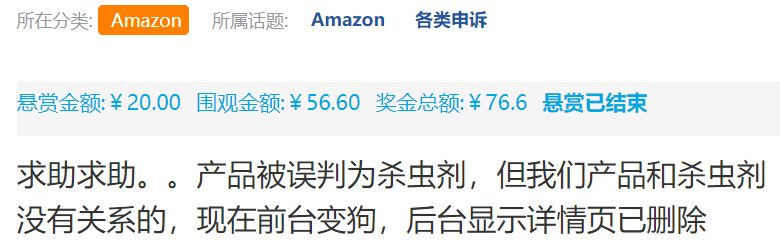 除了同行恶搞,有时候卖家更是无缘无故中招,好端端的一条链接被亚马逊判定为杀虫剂……比如下面这位卖家:“产品被误判为杀虫剂,但我们产品和杀虫剂没有关系,现在前台变狗,后台显示详情页已删除。”