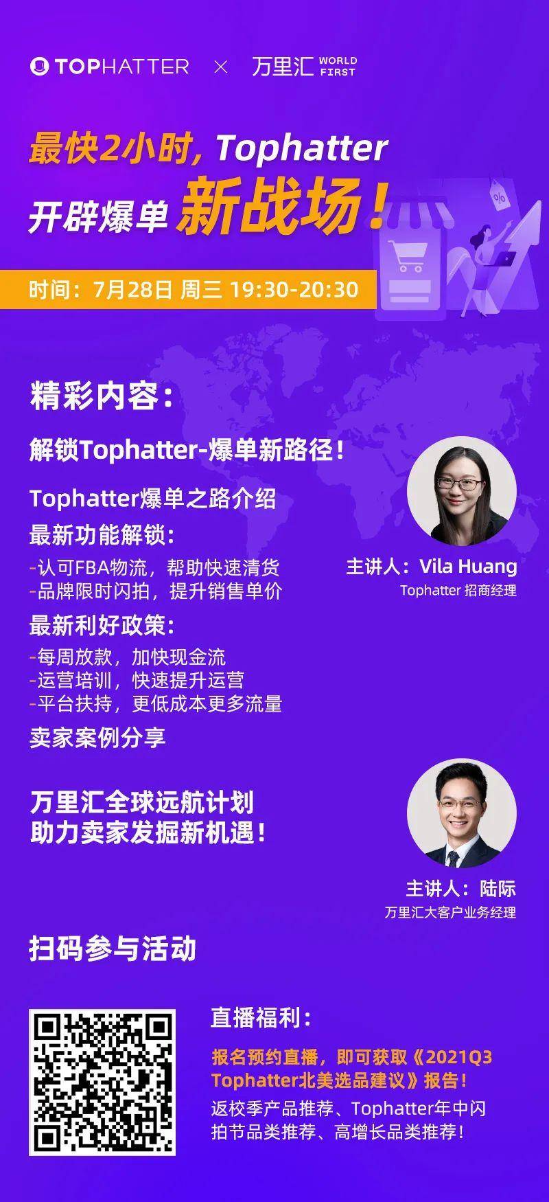 现在正是布局返校季、闪拍节的绝好时机,万里汇(WorldFirst)已经为大家备好了绿色开店通道,北美市场选品建议,还有美金扶持噢~想要的都帮你准备好了,想要入局Tophatter卖家朋友们还在等什么!快来扫码??加入吧!