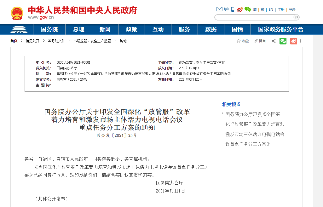 党中央、国务院高度重视深化“放管服”改革优化营商环境工作。2021年6月2日,李克强总理在全国深化“放管服”改革着力培育和激发市场主体活力电视电话会议上发表重要讲话,部署持续一体推进“放管服”改革,打造市场化法治化国际化营商环境,培育壮大市场主体,更大激发市场活力和社会创造力。为确保会议确定的重点任务落到实处,现制定如下分工方案。