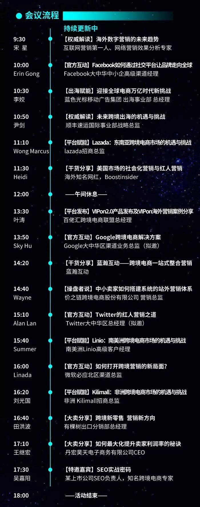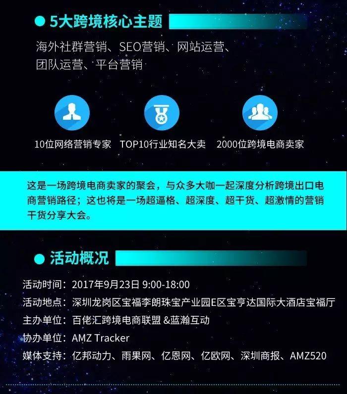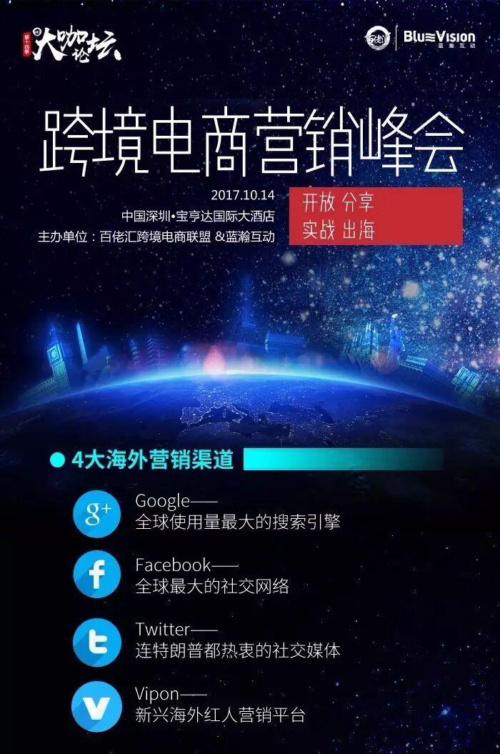 本次第十四季百佬汇大咖论坛主题为“跨境电商营销峰会”。我们很荣幸邀请到Facebook、Twitter、Google、Vipon四大海外营销平台官方代表来为深圳卖家分享营销策略和技巧。除此之外,还将有价之链、有棵树等行业大卖,Lazada、Paytm、Linio、Kilimall等新兴平台,和众多行业领袖与海外网红为我们分享营销秘籍。