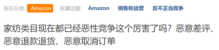 近日,一位家纺类目的亚马逊卖家在论坛上发帖怒斥竞争对手:最近上新了一款家纺产品,价格比同类产品高30%。新品推广很顺利,第三天关键词就上首页了。原本我们很开心,但是随之而来的却是对手的一连串恶意攻击,手段恶劣,令人怒不可遏。
