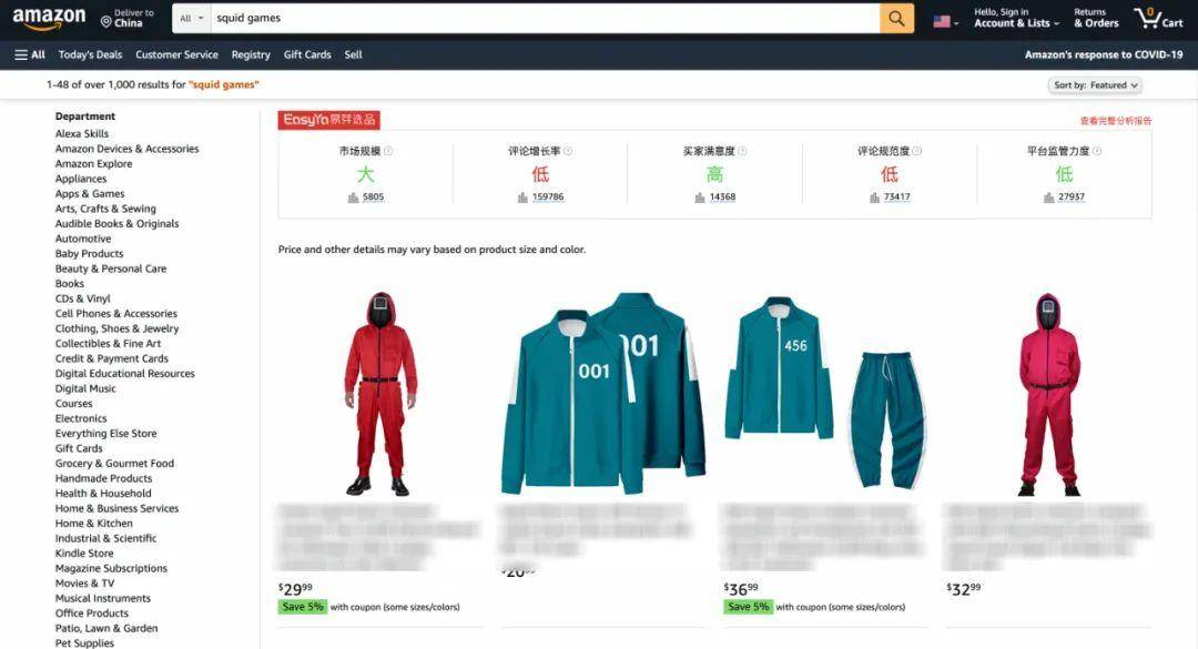 据悉,《鱿鱼游戏》上映后,短短不到2周时间内,“squid game”关键词在亚马逊上的搜索排名就已经飙到了第4。