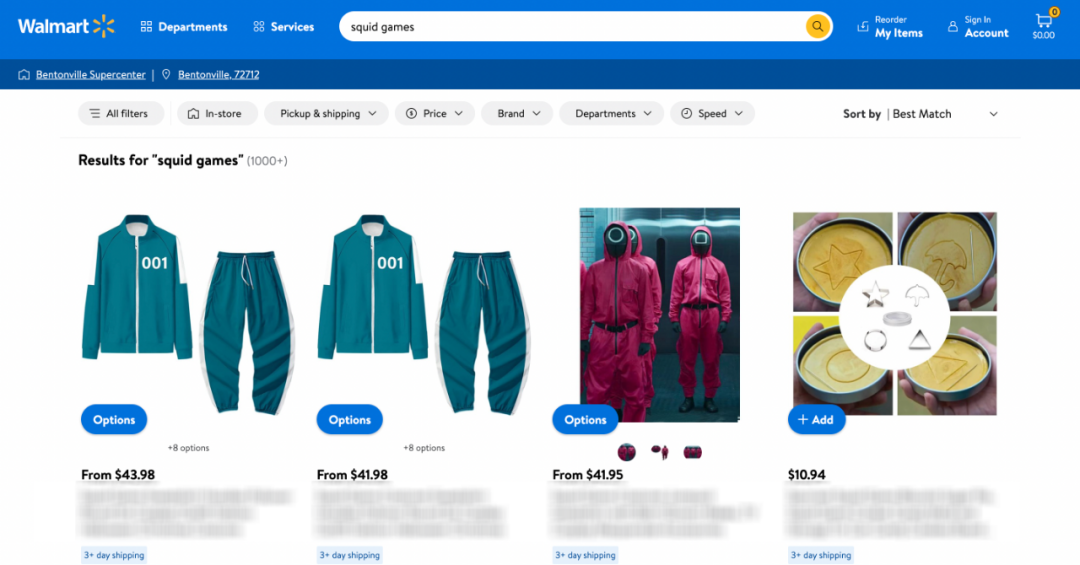 通过在亚马逊和沃尔玛平台对“squid game”等关键词进行搜索,可以知道《鱿鱼游戏》周边产品目前流量确实很大。