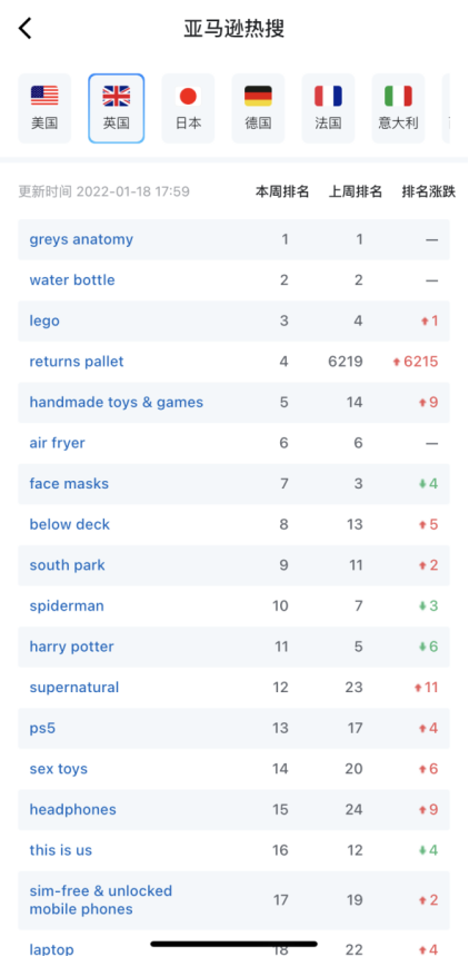 此外,LinkFox的首页可以直达亚马逊各站点的热搜词排行榜,帮助卖家快速掌握市场的大致动态和发展走向。这个功能有点类似于亚马逊版本的微博热搜一样,时不时去瞅一眼,能够帮助我们快速洞察全球各大亚马逊市场的变化趋势,从而不放过任何一个选品灵感和机会,而且对我们做产品的关键词调研和选择核心词也有很大的帮助。