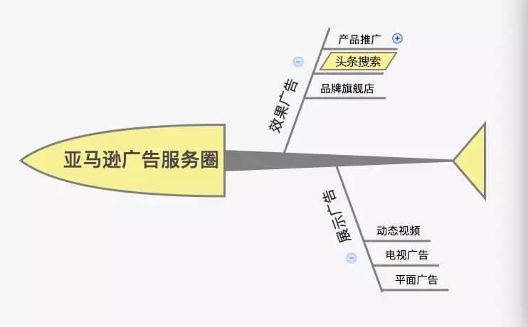 效果广告中的产品推广、“头条搜索广告(Headline Search Ad)品牌旗舰店”都在亚马逊广告服务圈里,下面是他们的关联图。