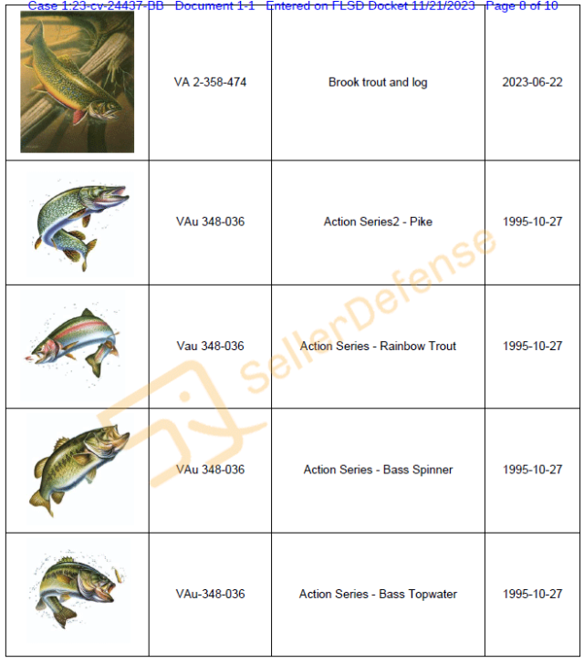 原告Jon Q. Wright专门从事鱼类相关的艺术,创作精美逼真的鱼插图、绘画和设计。本次案件维权作品注册时间最早1991年。