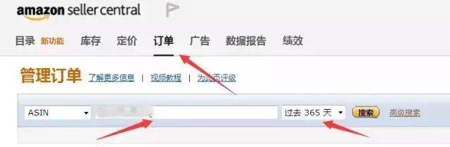 接下来进入亚马逊卖家操作后台,“订单”——“管理订单”页面,使用买家购买产品的ASIN为条件进行筛选,根据客户留评时间设定缩小筛选的时间范围。