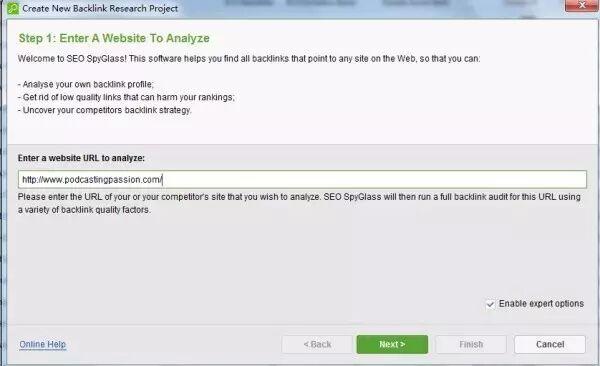 好了,现在我们就要查看https://www.podcastingpassion.com/ 这个链接有多少个外部链接。利用工具SEO SpyGlass