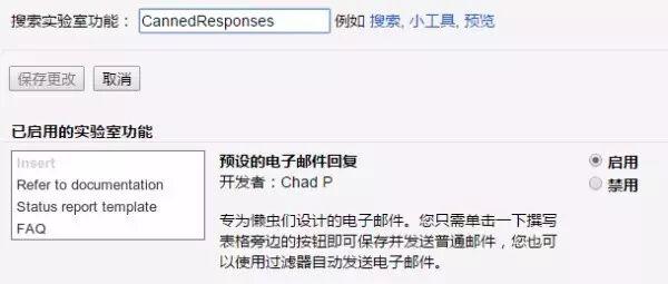 在搜索实验室中输入Canned Responses,中文名:预设的点赞邮件回复,如下图: