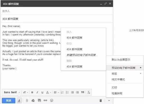 设置完毕之后,假设你现在在Gmail写的第一封邮件,那么你可以把这一封邮件设置为“预设的电子邮件回复”,这相当于是模板,然后你可以为这一封邮件起一个名字,比如“404 邮件回复”(名字你可以根据实际需要来起)。