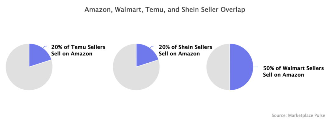 根据Marketplace Pulse的数据,截至2023年底,亚马逊和Temu、SHEIN的卖家重叠率已至少有20%,并在持续上升,这也意味着已有很大数量的卖家在同时运营多个平台。