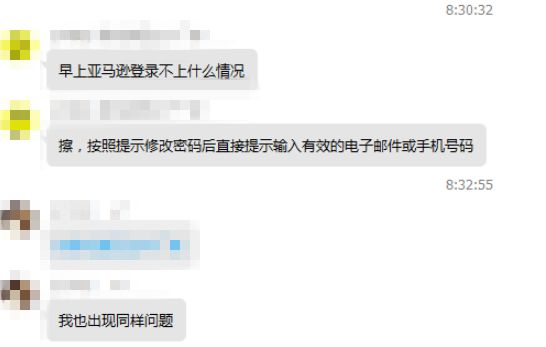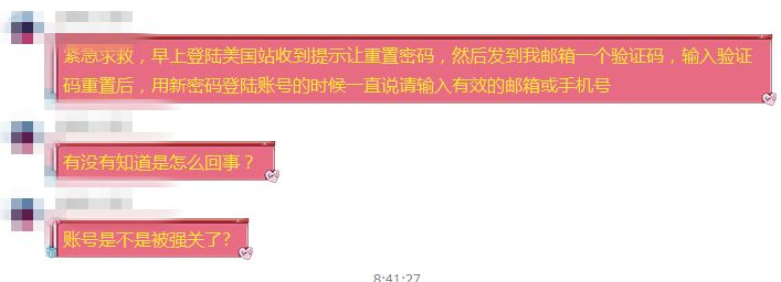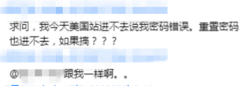 令这些卖家十分不安的是,正如一位卖家所说:“早上登陆美国站收到提示让重置密码,然后发到我邮箱一个验证码,输入验证码重置后,用新密码登陆账号的时候一直说请输入有效的邮箱或手机号。”就是修改密码之后仍然无法登陆,而是被反复提醒“请输入有效的电子邮件或手机号码”↓↓