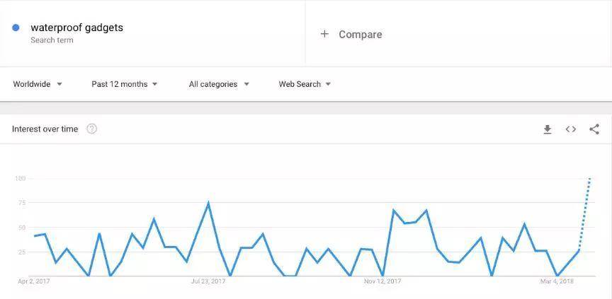 从谷歌搜索量就可以看出,人们已经开始关注防水手表、音箱、照相机等防水小玩意了。