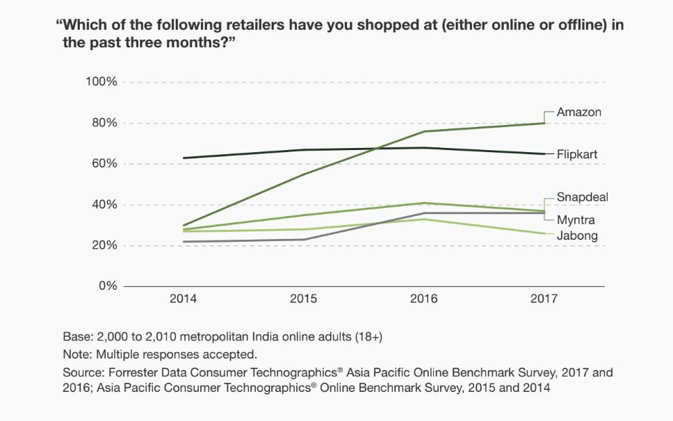 2014年以来,印度电商平台在印度消费者中的认可度对比图: