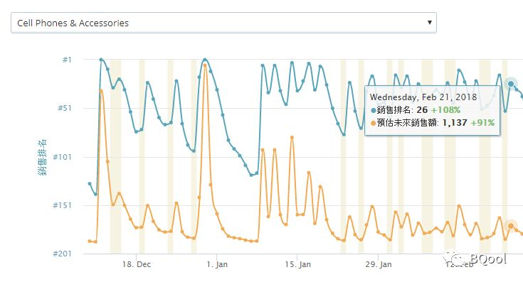平平稳稳的销售是没有办法一次打破你的排名的,一定要有一个销售的波峰来突破原本排名!举例来说,如果每天平均出 2 单,突然有一天出 20 单,然后后五天每天平均出 10 单,这就创造了一个波峰!以下举例一个手机支架,经过两次的波峰之后,排名再也没掉出 50 名之后。你可以利用 BigTracker 选品酷 来追踪潜在爆款的走势,也可以观察竞争对手的波峰!