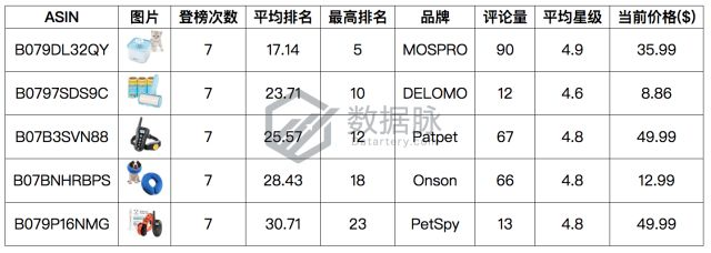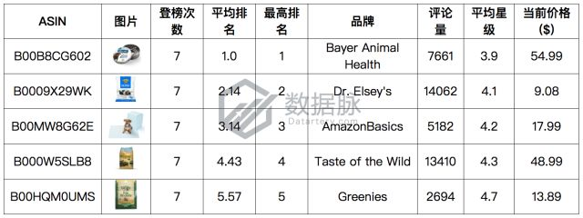 AmazonBasics的经典宠物尿垫、Taste of the Wild的无谷物高蛋白狗粮本期依然上榜单前五,分别以3.14、4.43的平均排名位列商品排名第三第四,该款高蛋白狗粮提供了9种不同的蛋白质选择。