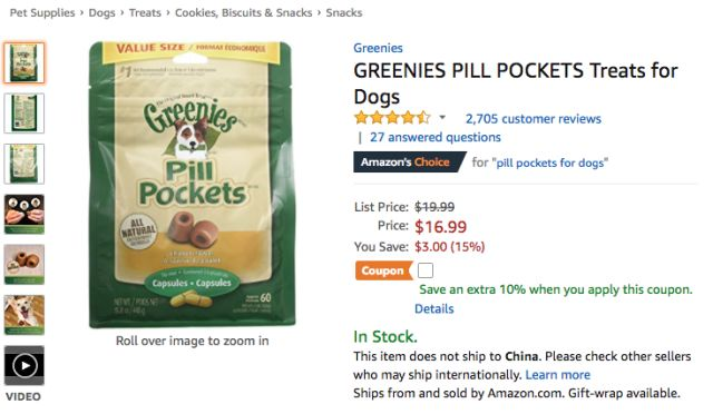 来自品牌Greenies的宠物狗药丸囊提供了三种口味选择帮助狗狗服用难吃的药物,该商品以累计评论量2694、平均评价星级4.7的良好口碑和平均排名5.57登上商品排名第五,平均售价$13.89。