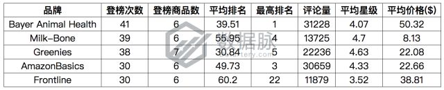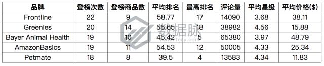 骆探长(shujumai.com)发现,在上周Pet Supplies品类的Best Seller榜单中,相比上期分析,骆探长(shujumai.com)发现,宠物护理品牌Bayer Animal Health、宠物零食品牌Milk-Bone和专业生产宠物咀嚼物的Greenies本期依然强势登榜,一周内分别登榜41次、39次和38次,在品牌排名中分别位列第一、第二和第三。Bayer Animal Health提供了多款宠物驱虫产品;Milk-Bone是一家专注于生产宠物狗饼干和耐咀嚼零食的公司,自1908年就生产了该公司的第一块狗狗饼干;Greenies畅销的产品主要是几款能够清洁宠物狗牙齿、清新口气的美味咀嚼骨头,好似牙刷一般护理宠物口腔。本期AmazonBasics亚马逊自有品牌以6款商品登榜、共登榜30次暂居品牌排行第四。排行第五的品牌Frontline专注于提供宠物猫狗的外用跳蚤和虱子驱逐药物,本周以平均评价星级3.52抗压登榜,登榜商品数6款。本期上榜的宠物驱蚊虫品牌有两个,然而Frontline产品口碑不佳,同类产品的卖家若能提供优质的产品赢得口碑则能争取到一定的市场空间。