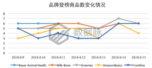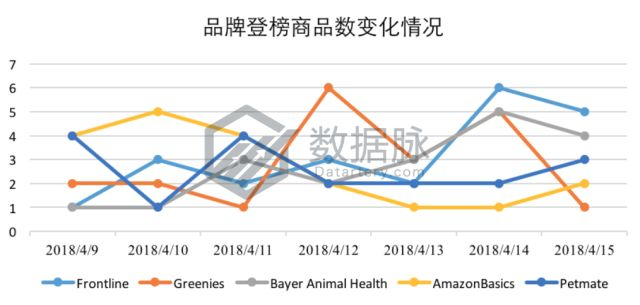 骆探长(shujumai.com)发现,在上周Pet Supplies品类的Movers & Shakers榜单中,品牌竞争依旧激烈。提供宠物驱虫药物的Frontline在上周有9款商品登上销量飙升榜,但平均评价星级低,产品口碑不佳为其他卖家提供了机会。Greenies提供宠物牙齿清洁咀嚼物,上周以14款商品登榜、共20次登榜、最高排名18的表现位列品牌第二。亚马逊AmazonBasics自营产品宠物用品类目有11款产品登榜,共登榜19次,与主营宠物蚊虫卫生防护用品的品牌Bayer Animal Health分别排名第四和第三。排名第五的是提供丰富产品线的宠物用品品牌Petmate,本期上飙升榜的商品有8款,最高排名第4。