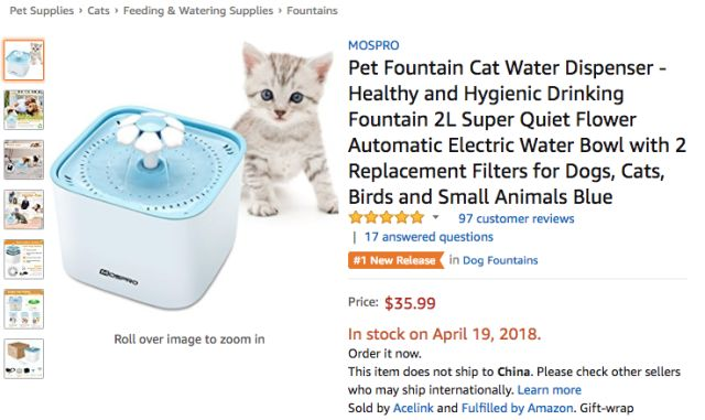 在上周Pet Supplies品类的Hot New Releases榜单中,综合排名前五商品中有两款训练用狗项圈,其他三款产品分别是宠物饮水机、粘毛滚筒和保护性充气狗项圈。骆探长(shujumai.com)发现,本期的热门新品榜单前五的商品评论量均不超过100条,这几类商品的后续市场空间值得关注。来自品牌MOSPRO的宠物喷泉饮水机于4月09日至12日一度占领榜单第五位,在后续几天榜单表现有所冷却,最终取得了17.14的平均排名成绩,位列商品综合排名第一,该饮水机具备过滤装置,能够给宠物带来较好的饮水体验,其优雅的外观也能起到一定的装饰作用,平均评价星级4.9深受买家喜爱。