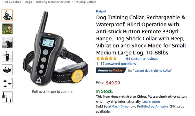 Patpet和PetSpy的宠物狗训练项圈分别位列商品排名第三和第五,平均评价星级均为4.8,评价数量分别为67和13,前者适合10-88磅的狗、控制范围330码,后者适合10-140磅的犬种、控制范围900码。