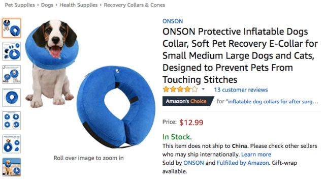 排名第四的是一款用于防治适用于中小型犬和猫接触伤口和手术部位的充气保护项圈,来自亚马逊卖家Onson,平均评价星级4.8,平均售价$12.99,本期商品排名较稳定,平均排名30.71。