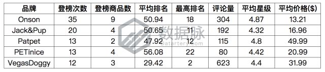 根据上周BestSeller榜单上各个品牌下商品的登榜次数,骆探长(shujumai.com)对登榜的品牌进行了排序,其中排名靠前的五个品牌如下所示: