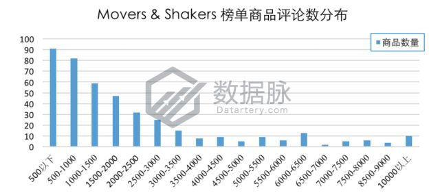在上周登榜Pet Supplies品类Movers & Shakers榜单的商品中,单个商品拥有的最大评论数为18942,最小评论数为8条,平均评论数2263.44条,评论平均星级4.32星。骆探长(shujumai.com)发现,相比上期分析,平均星级下降0.03星;相较上期,评论数在500条以内的上榜商品数量商品数量和占比均明显增加,占比达21.26%;有19.16%的商品评论数位于500条至1000条区间内;此外,有10款商品的评论数超过10000条。结合前期分析,本期评论数低于500条的商品飙升机会有所上升。