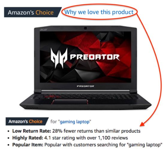例如,亚马逊让Acer Predator Helios 300游戏本获得了“Amazon’s Choice”标签,原因是该产品:
