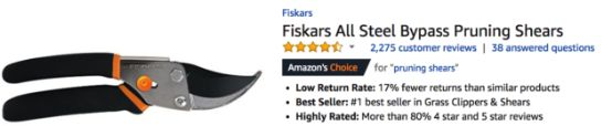不仅仅只有电子产品会显示获选“Amazon’s Choice”的原因,园艺工具Fiskars All Steel Bypass Pruning Shears产品页上也出现了: