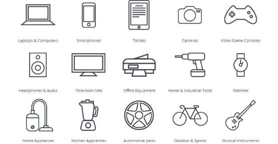 笔记本及台式电脑;智能手机;平板电脑;照相机;电子游戏机;耳机和音响;电视机;办公设备;家用及工业工具;手表;家用器具;厨房器具;机动车配件;户外运动用品;乐器。
