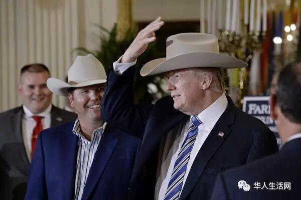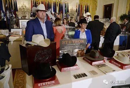 图为特朗普头戴美国产的“斯泰森帽”与厂商交谈