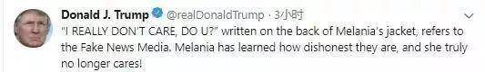 美国总统特朗普随后发推谈到了自己妻子的这件衣服,不过他的说法却截然不同,直言上面写的文字确实传递了某种信息。但特朗普称:“梅拉尼娅夹克背后写着的话指的是假新闻媒体。梅拉尼娅知道它们有多么的不诚实,她也确实不在意它们。”